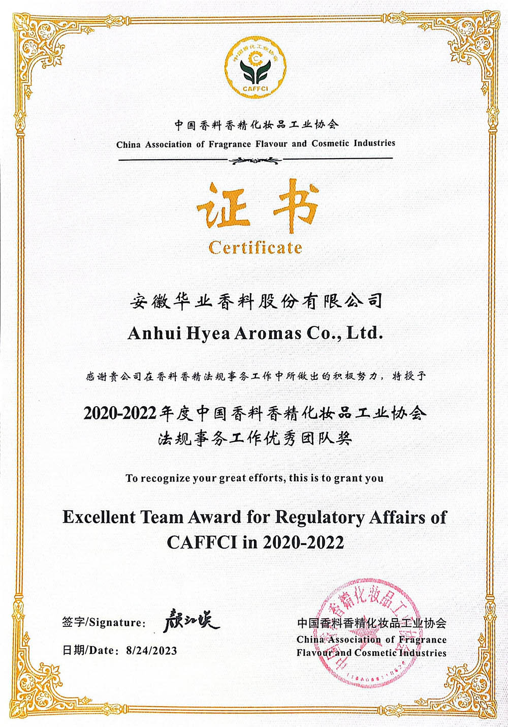 2020-2022年度中國香料香精化妝品工業(yè)協(xié)會法規(guī)事務(wù)工作優(yōu)秀團隊獎